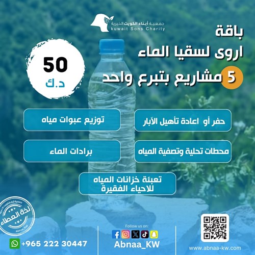 بتبرع واحد يمكنك المساهمة في : حفر أو إعادة تأهيل الآبار - توزيع عبوات مياه - محطات تحلية وتصفية المياه -برادات ماء - تعبئة خزانات مياه للأحياء الفقيرة .