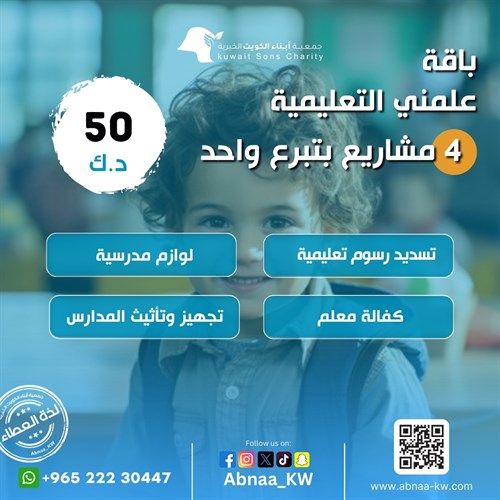 4 مشاريع في تبرع واحد ( تسديد رسوم تعليمية - لوازم مدرسية - كفالة معلم - تأثيث وتجهيز المدارس ) .