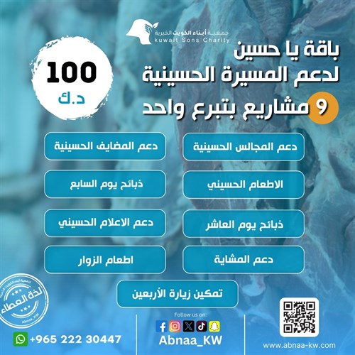 9 مشاريع بترع واحد ( دعم المجالس الحسينية - دعم المضايف الحسينية - الإطعام الحسيني - ذبائح يوم السابع - ذبائح يوم العاشر - دعم الإعلام الحسيني - دعم مشاية الأربعين - إطعام الزوار