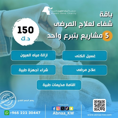 بتبرع واحد يمكنك المساهمة في : علاج مرضى - غسيل كلى -ازالة مياه العيون - شراء أجهزة طبية .
